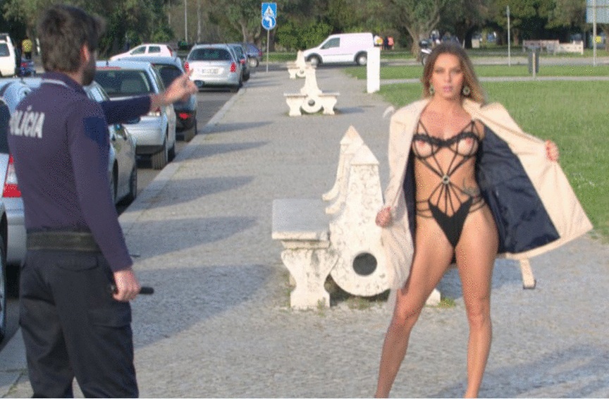 O problema é que a beldade estava seminua em um ponto turístico de Lisboa, o Padrão dos Descobrimentos, e foi abordada por policiais. Segundo a agência de fotografia AGNews, a loira que estava com os seios à mostra ainda chegou a discutir com um policial e provocá-lo, exibindo suas curvas, mas foi levada para a delegacia para prestar esclarecimentos.