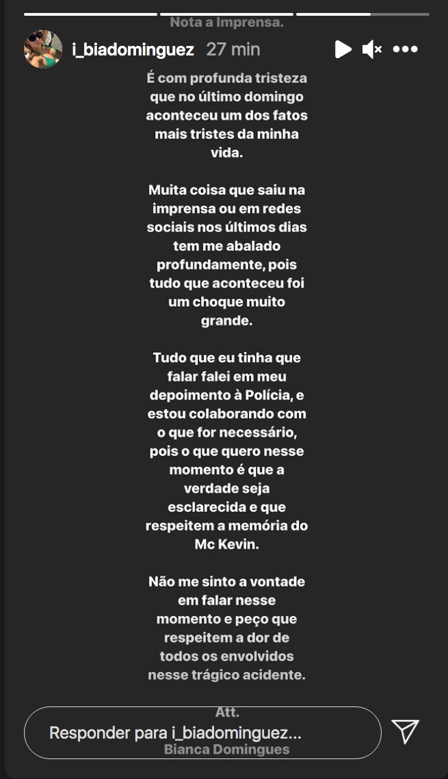 Em depoimento à polícia, Bianca contou que conheceu Kevin e o amigo em um quiosque e que depois foram para o quarto no 5º andar do hotel, na Barra da Tijuca. No mesmo hotel estava a esposa do MC, Deolana Bezerra, que estava no quarto no 11º andar.