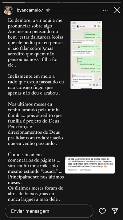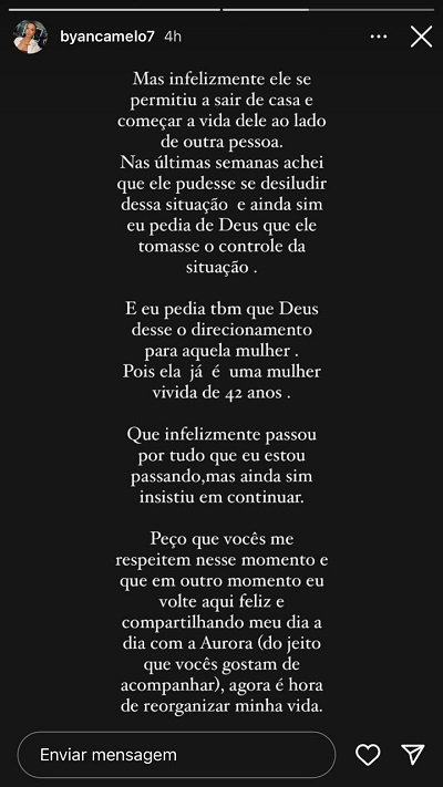"Nos últimos meses venho lutando pela minha família...pois acredito que família é projeto de Deus (...) fui mãe solo, mesmo estando "casada", principalmente nos últimos meses", disse Byanca. Em seguida, ela revelou que o humorista saiu de casa para viver com outra mulher, de 42 anos.