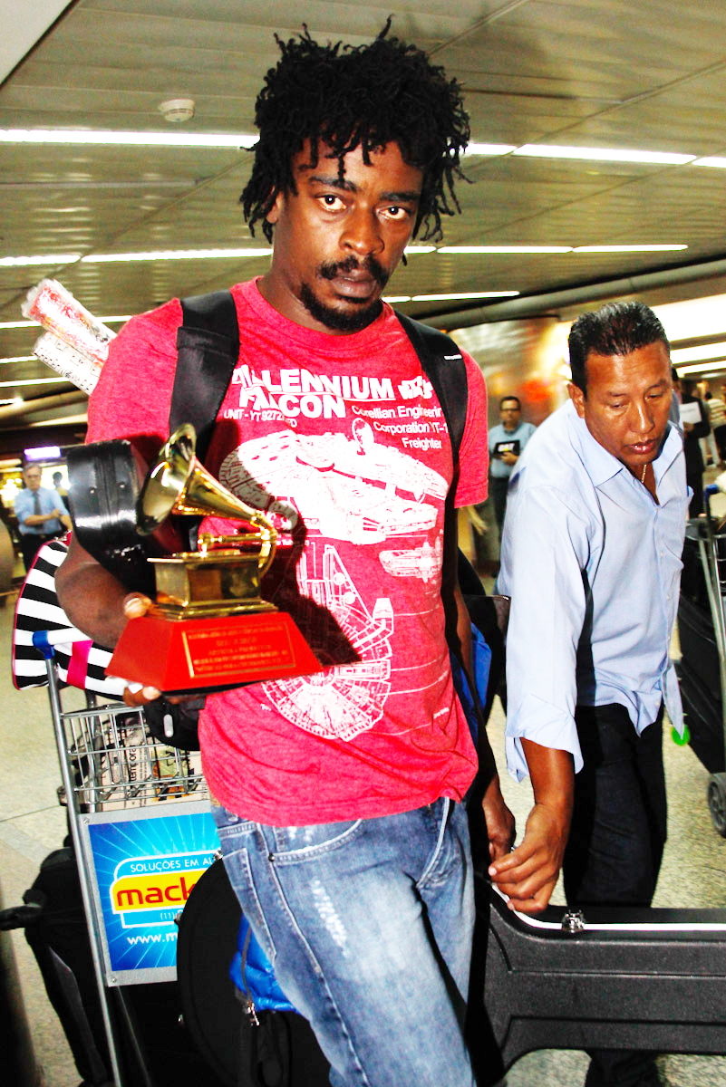 O cantor, compositor e ator Seu Jorge , foi flagrado desembarcando no Aeroporto Internacional de Guarulhos/SP, depois de uma temporada nos Estados Unidos. Seu Jorge exibiu com orgulho ao fotógrafo o Grammy Latino , seu prêmio em formato de gramofone, recebido em cerimônia realizada em Novembro do ano passado (2012), nos EUA.