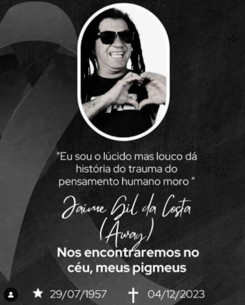 Morreu o humorista Jaime Gil da Costa, de 66 anos, conhecido como Gil Brother Away, ex-integrante do grupo Hermes e Renato. O falecimento aconteceu no domingo à noite, mas só foi informado aos familiares na manhã desta segunda-feira (4).