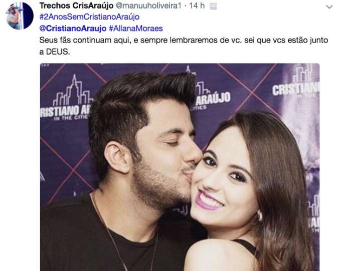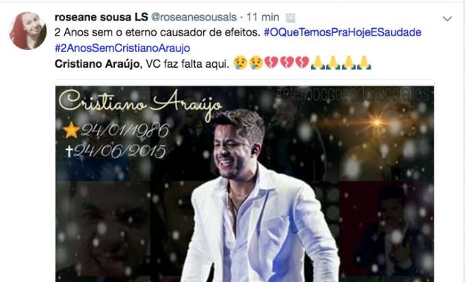 “2 anos sem meu anjo aqui! Ainda sinto saudades CristianoAraujo, esteja em paz ai olhando por todos”, escreveu outra.