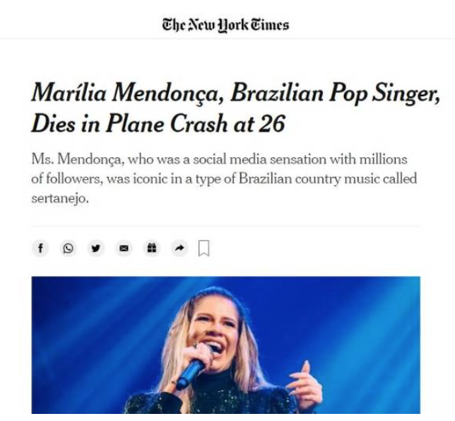 A morte da cantora Marília Mendonça, aos 26 anos, em um acidente de avião no interior de Minas Gerais, nesta sexta-feira (05), ganhou repercussão internacional.