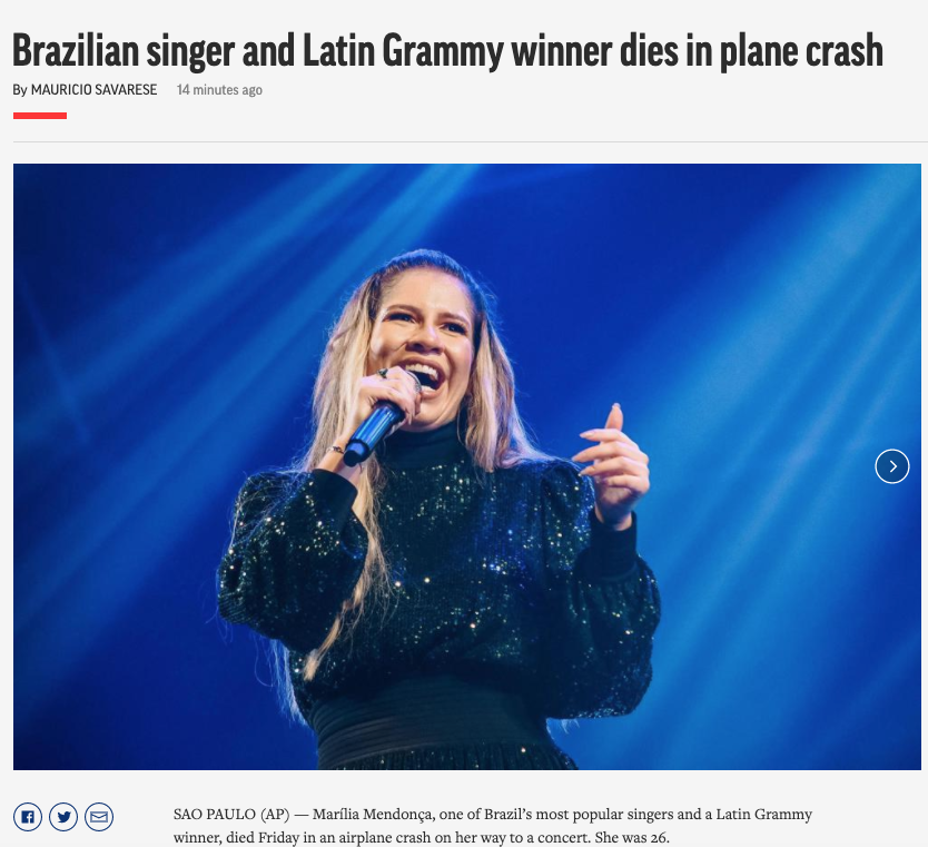 Já a Reuters disse que Marília Mendonça ganhou fama como "ícone do sertanejo", ganhando um Grammy Latino 2019 por álbum na categoria. "Ela postou nas redes sociais um vídeo embarcando no avião na sexta-feira", lembrou a agência.
