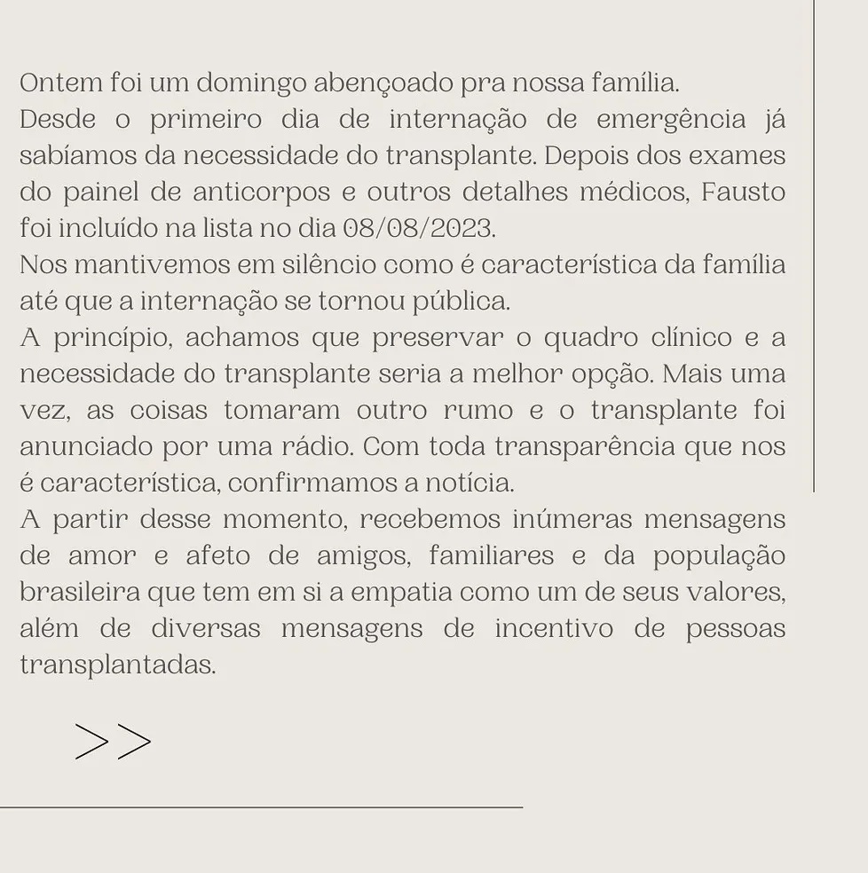 Luciana também agradeceu à família do doador: "Ontem foi um domingo abençoado para nossa família. Desde o primeiro dia de internação de emergência já sabíamos da necessidade do transplante. Depois dos exames de painel de anticorpos e outros detalhes médicos. Fausto foi incluído na lista no dia 8 de agosto de 2023", esclareceu.