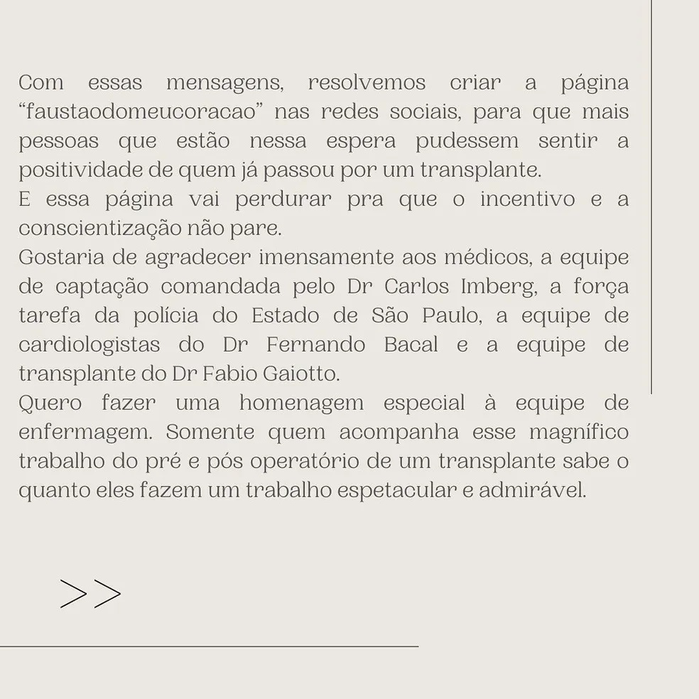 "Resolvemos criar a página Faustão no Meu Coração nas redes sociais, para que pessoas que estão nessa espera pudessem sentir a positividade de quem já passou por um transplante. E essa página vai perdurar para que o incentivo e a conscientização não pare", contou ela, que em seguida agradeceu aos médicos, a Deus e a todas as orações de todas as religiões.