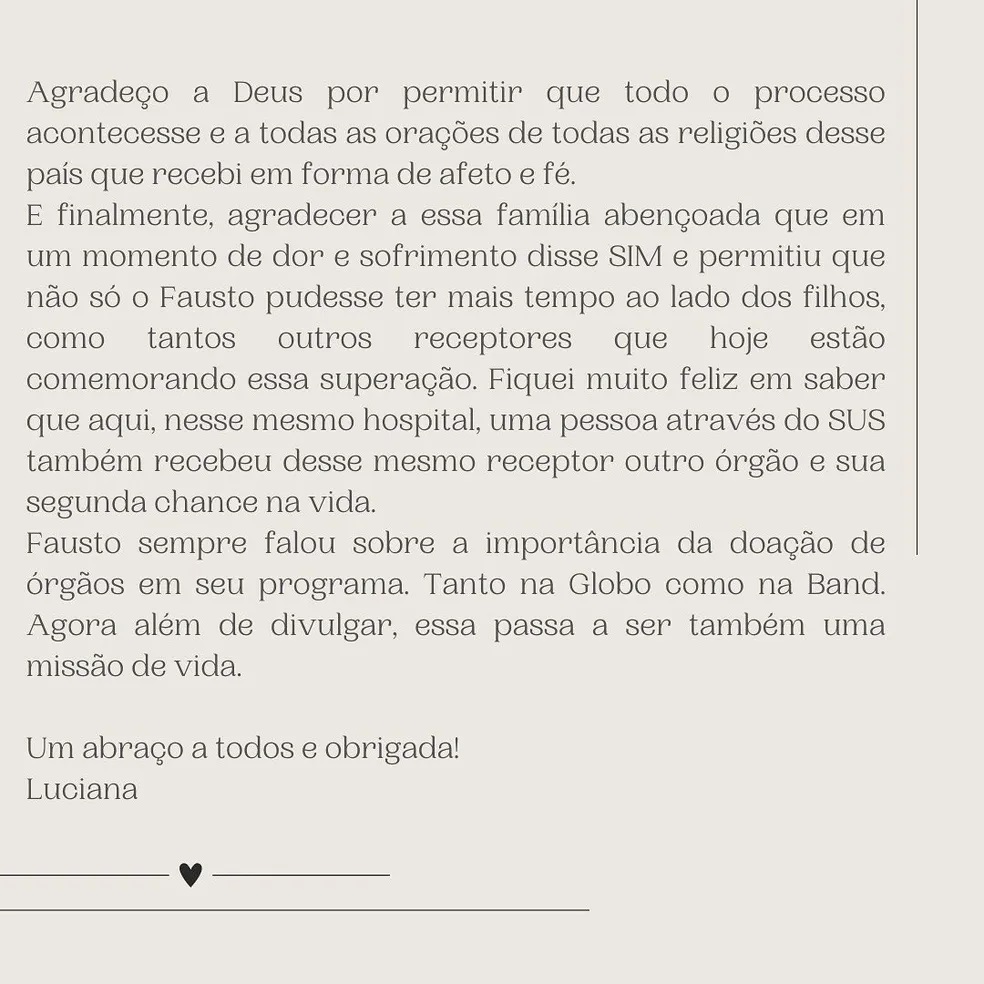 Por fim, Luciana agradeceu à família do doador: "E, finalmente, quero agradecer a essa família abençoada que em um momento de dor e sofrimento disse SIM e permitiu não só que Fausto pudesse ter mais tempo ao lado dos filhos, como tantos outros receptores que hoje estão comemorando essa superação. Fiquei muito feliz em saber que aqui, nesse mesmo hospital, uma pessoa através do SUS também recebeu desse mesmo receptor outro órgão e sua aguardada chance na vida."