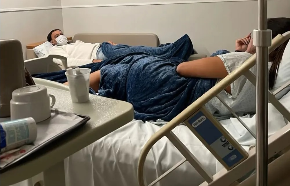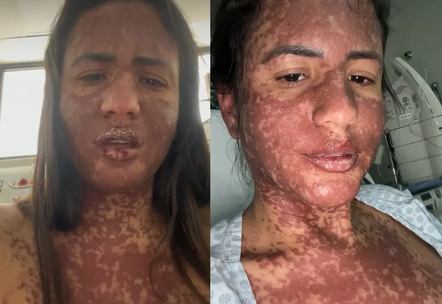 Caroline Aguiar, de 31 anos, esposa do cantor Frank Aguiar, foi internada por dez dias na UTI de um hospital devido à síndrome de Stevens-Johnson, uma doença rara que queima a pele.