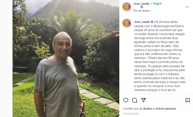 "Há 24 anos estou casada com o Stênio Garcia. E nesses 24 anos, ao contrário do que vocês estão dizendo, nunca teve relação de briga entre nós. Jamais teve agressão verbal ou física nem da minha parte e nem da dele. Nós usamos o princípio do yoga Ahinsa, que é a não violência em todos os sentidos", escreveu Mari.