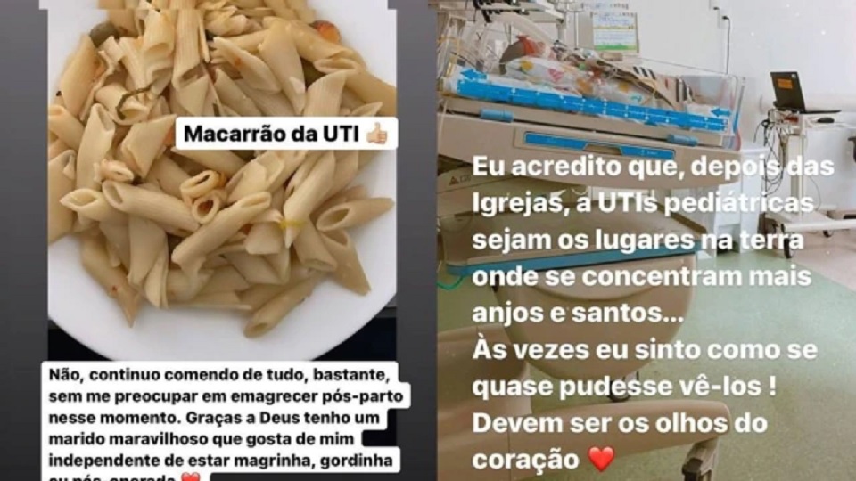 "Pra galera que pergunta se eu como alguma coisa especial pra aumentar a produção de leite... Não, continuo comendo de tudo, bastante, sem me preocupar em emagrecer pós-parto nesse momento. Graças a Deus tenho um marido maravilhoso que gosta de mim independente de estar magrinha, gordinha ou pós-operada", escreveu Letícia ao mostrar um prato de macarrão.