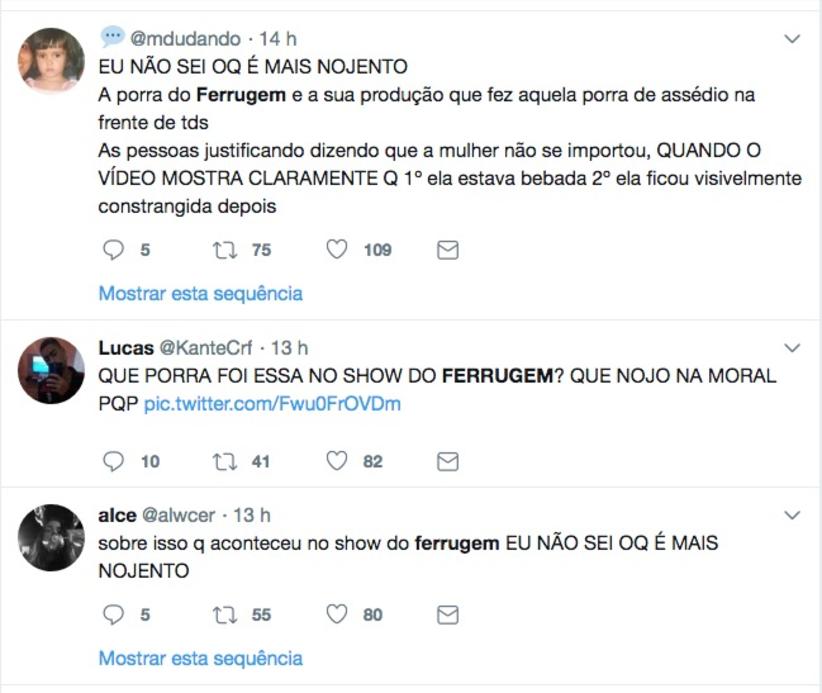 O namorado que está na plateia aparentemente tentou impedir o que estava acontecendo, mas teria sido barrado por seguranças. Depois que o rapaz reclama, Ferrugem ainda diz que ele é o errado por ter "deixado" a namorada subir.