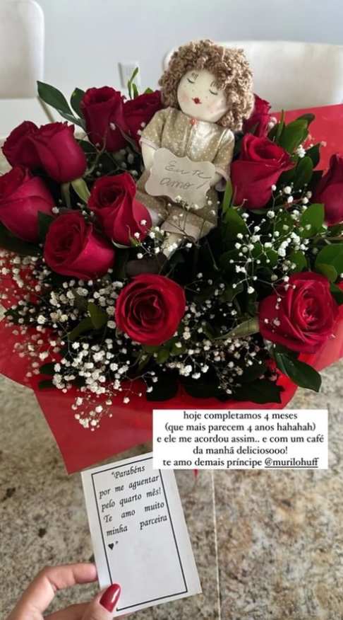 Gabriela fez questão de mostrar todos os mimos do sertanejo nas redes sociais. "Hoje completamos 4 meses (que mais parecem 4 anos). Ele me acordou assim [com flores] e com um café da manhã delicioso”, escreveu ela.