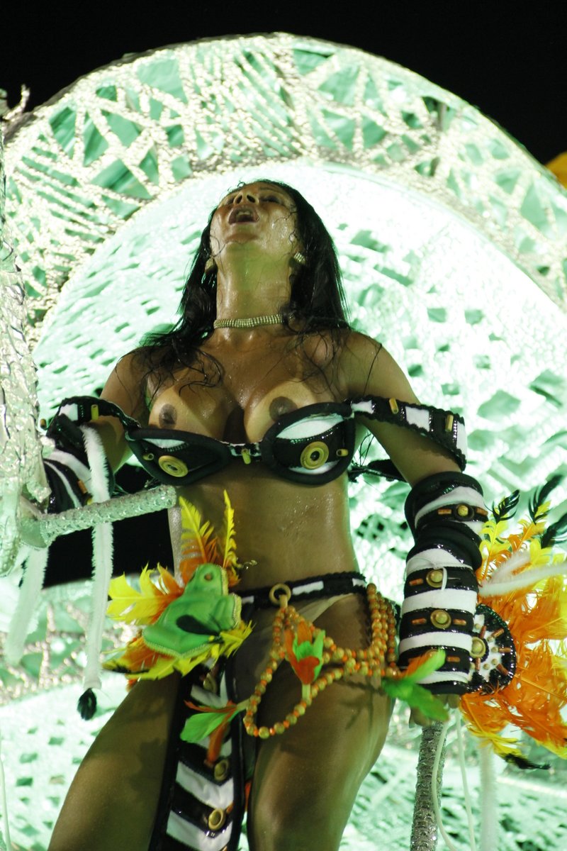 Uma das musas de Destaque da Imperatriz se empolgou e acabou mostrando demais. A morena dançava no desfile das vencedoras, na Sapucaí, e nem ligou para os seios completamente à mostra.