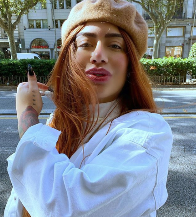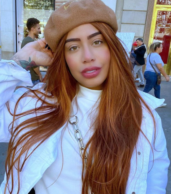 A ruiva compôs o look com uma boina, moletom branco e uma pochete da grife Balenciaga.