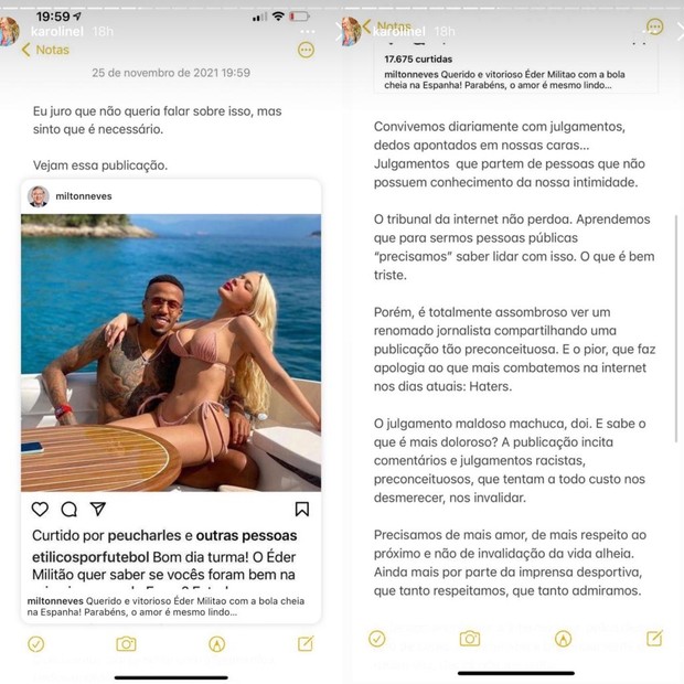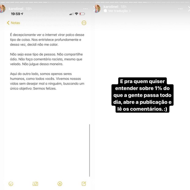 "Eu juro que não queria falar sobre isso, mas sinto que é necessário. Vejam essa publicação. Convivemos diariamente com julgamentos, dedos apontados em nossas caras… Julgamentos que partem de pessoas que não possuem conhecimento da nossa intimidade. [...] É totalmente assombroso ver um renomado jornalista compartilhando uma publicação tão preconceituosa.", começou Karoline.