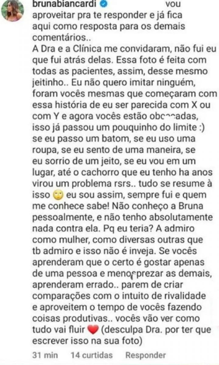 A influenciadora deu um basta nos comentários de que “quer ser” Bruna Marquezine após receber um comentário sobre ter feito o mesmo procedimento estético na mesma profissional que a atriz realizou um tratamento.