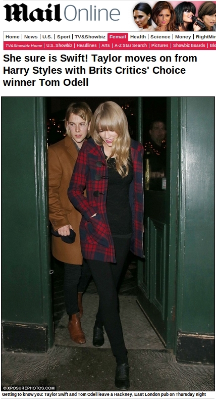 Mal esfriou o fim do namoro da cantora com Harry Styles , do One Direction , em janeiro e a loira já é vista com um novo rapaz. Mesmo com a moça no seu país natal, ex-namorado não pareceu querer reconciliação e também já foi clicado com outras garotas. Já para Taylor , o sortudo da vez é o cantor britânico Tom Odell , que recebeu o prëmio de escolha de crítica no Brit Awards .