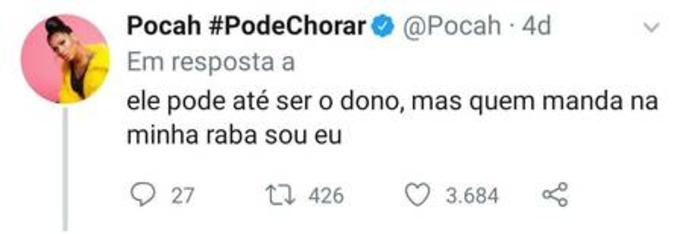 Em vídeo que circula nas redes, Pocah aparece dançando o seu hit ‘ninguém manda nessa raba’ durante uma festa. Quem pareceu não concordar muito foi o namorado dela, Ronan Souza, ex- de Anitta.