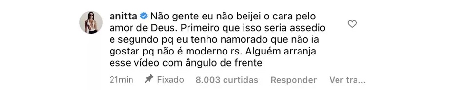 No entanto, Anitta garante que não beijou até porque isso seria assédio, além do que o seu namorado não iria gostar, e pediu para alguém que estava no show encontrar o vídeo feito de frente, de outro ângulo que mostre o que realmente aconteceu, provando que ela não beijou.