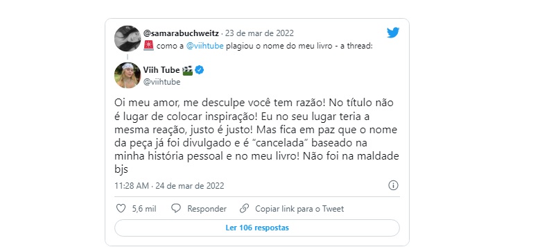 Viih Tube, por sua vez, respondeu Samantha no Twitter e escreveu: "Oi meu amor, me desculpe, você tem razão! No título não é lugar de colocar inspiração! Eu no seu lugar teria a mesma reação, justo é justo! Mas fica em paz que o nome da peça já foi divulgado e é "cancelada" baseado na minha história pessoal e no meu livro! Não foi na maldade, beijos".
