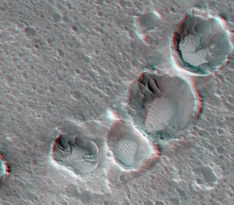 A borda da cratera não é muito clara e só pode ser vista pelo padrão de sombreamento. Marcas de impacto menores dentro da grande cratera são mais visíveis.