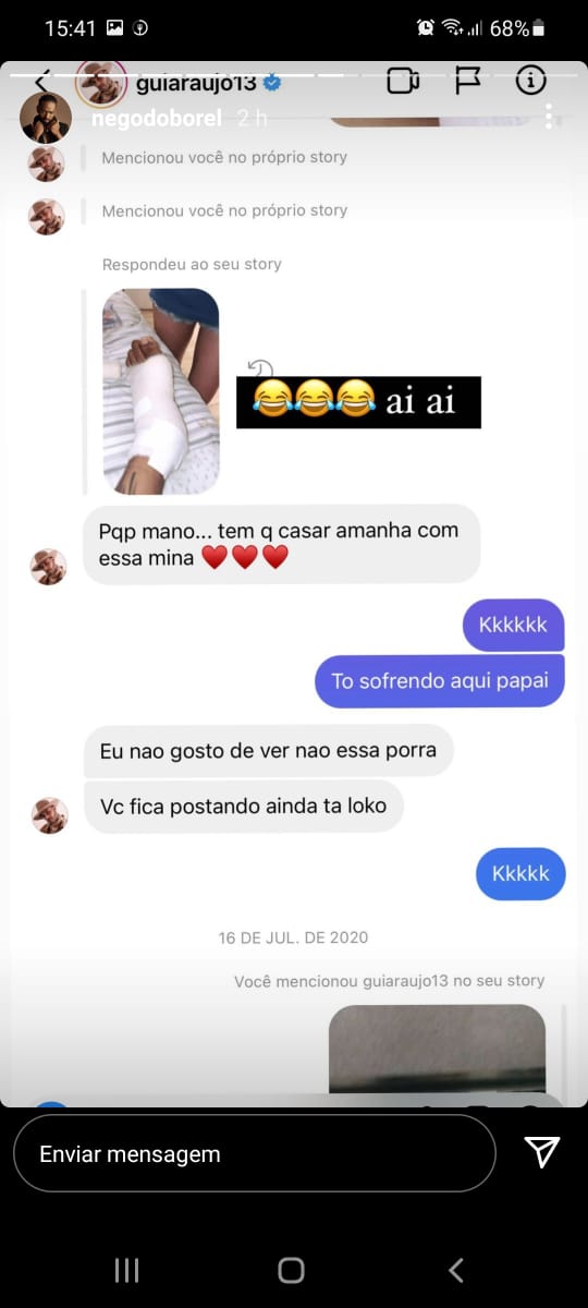 O cantor compartilhou prints de conversas com Gui, onde o peão apoia o relacionamento de Nego com Duda Reis, e depois dá apoio ao funkeiro durante toda a polêmica de agressão.