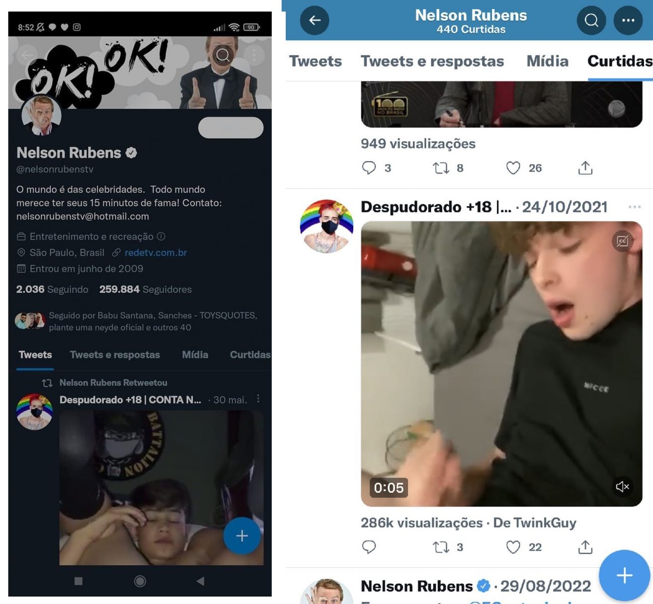 Nelson Rubens deixou escapar em sua conta do Twitter várias curtidas em imagens de pornô gay. Os likes foram percebidos na segunda-feira e até esta terça-feira (27) um deles bem explícito ainda estava lá. A conta é verificada, mas não se sabe se é ele mesmo quem usa a rede social ou alguém da sua equipe.
