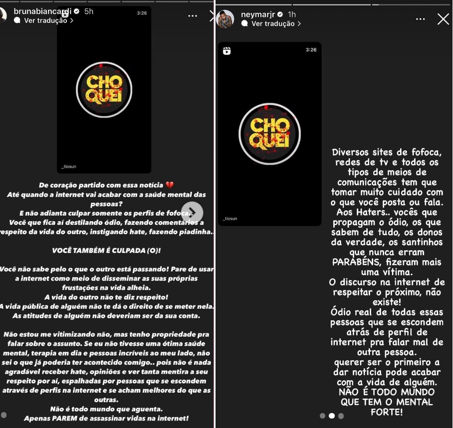 “Diversos sites de fofoca, redes de tv e todos os tipos de meios de comunicações têm que tomar muito cuidado com o que você posta ou fala. Aos haters, vocês que propagam o ódio, os que sabem de tudo, os donos da verdade, os santinhos que nunca erram, Parabéns, fizeram mais uma vítima. O discurso na internet de respeitar o próximo, não existe. Ódio real de todas essas pessoas que se escondem atrás de perfil de internet para falar mal de outra pessoa, querer ser o primeiro a dar notícia, pode acabar com a vida de alguém. Não é todo mundo que tem o mental forte”, escreveu Neymar.