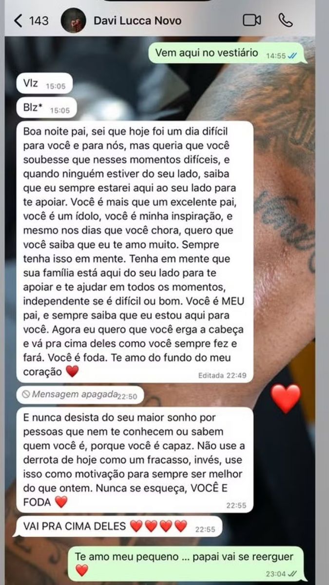 Neymar mostrou nas redes sociais uma mensagem cheia de afeto que recebeu do filho, Davi Lucca, após a derrota do Santos para o Vasco por 6 a 0, no domingo (17). O garoto, de 13 anos, decidiu confortar o pai diante do resultado difícil.
