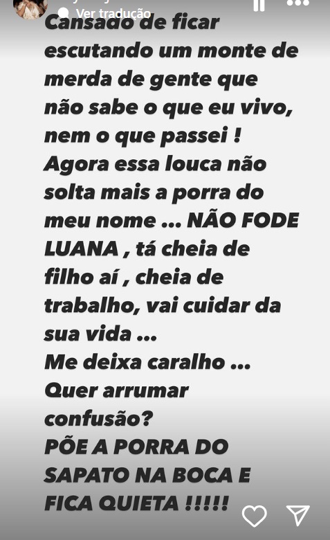 O jogador disse que o tempo de Luana já passou e a mandou enfiar um sapato para calar a boca.