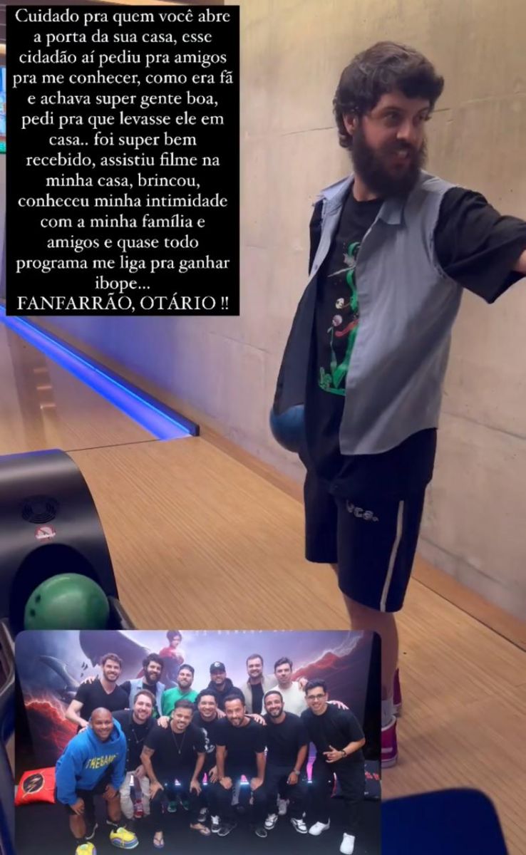 “Cuidado pra quem você abre a porta de sua casa. Esse cidadão aí pediu pra amigos para me conhecer, como era fã e achava super gente boa, pedi pra que levasse ele em casa... foi super bem recebido, assistiu filme na minha casa, brincou, conheceu minha intimidade com a minha família e amigos e quase todo programa me liga para ganhar ibope. Fanfarrão, otário”, escreveu o jogador.