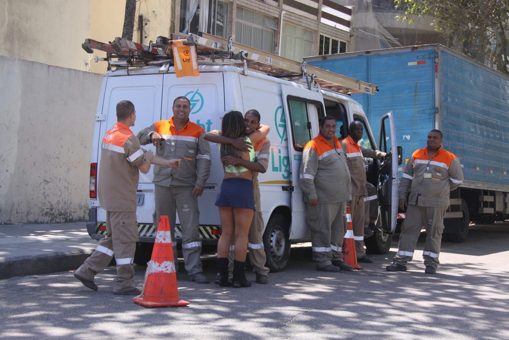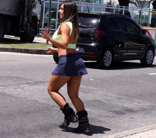 Com um modelito sexy de barriga sarada e pernões de fora, a morena se divertiu e ainda fez a alegria e abraçou alguns trabalhadores na Barra da Tijuca, no Rio de Janeiro, que admiravam a beldade.