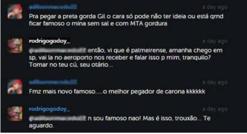 Sem perder tempo, Rodrigo disparou: “Vi que é palmeirense, amanhã chego em São Paulo, vai lá no aeroporto nos receber e falar isso pra mim pessoalmente, tranquilo? Tomar no teu..., seu otário”.