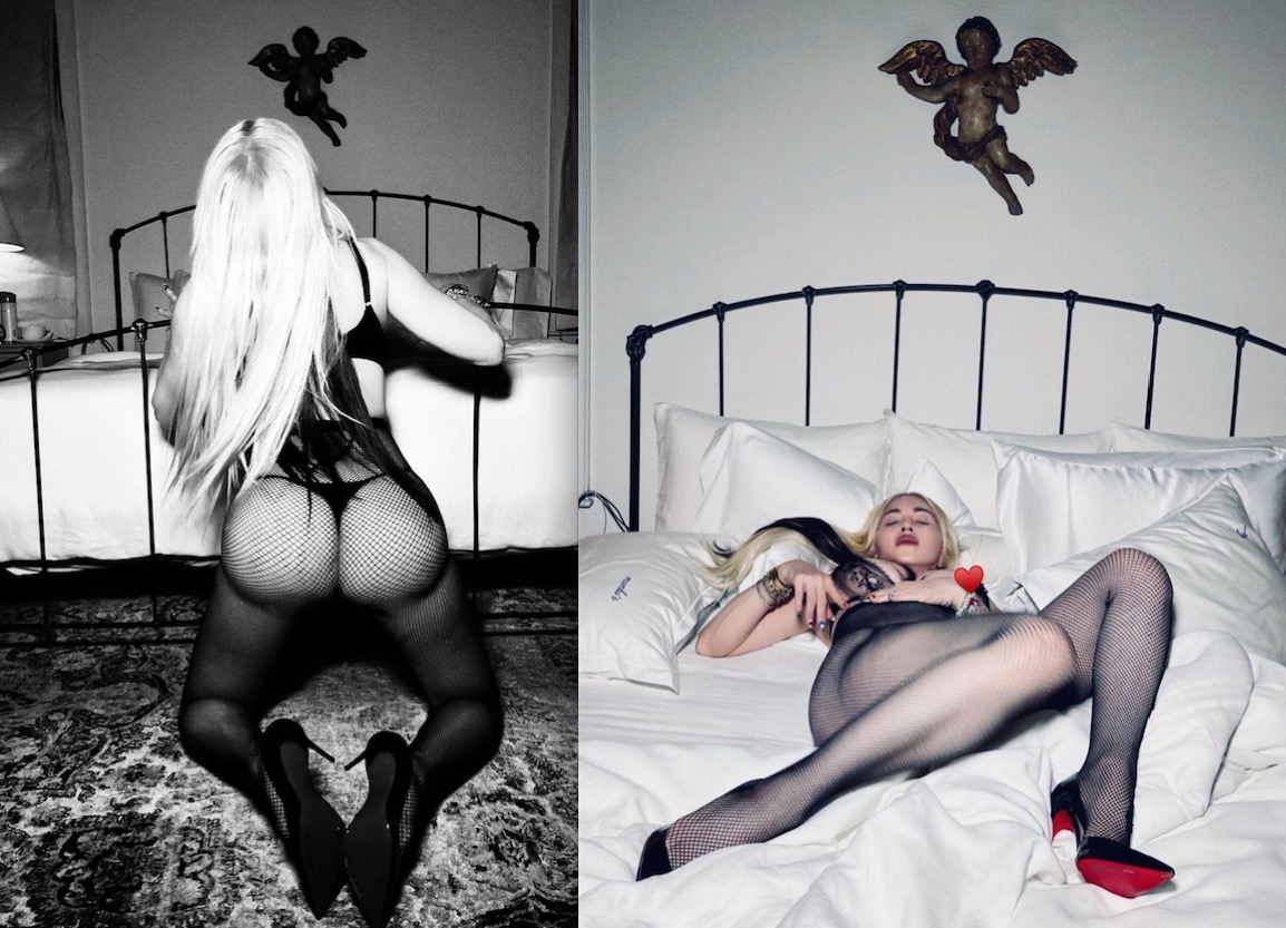 Madonna publicou fotos no Instagram nesta quinta-feira (25), com posições ousadas e pouca roupa. Nas imagens, a rainha do pop - que diga-se de passagem, sempre foi ousada - aparece com seio de fora, além de exibir o bumbum sem calcinha, a bordo de apenas uma meia-calça transparente.
