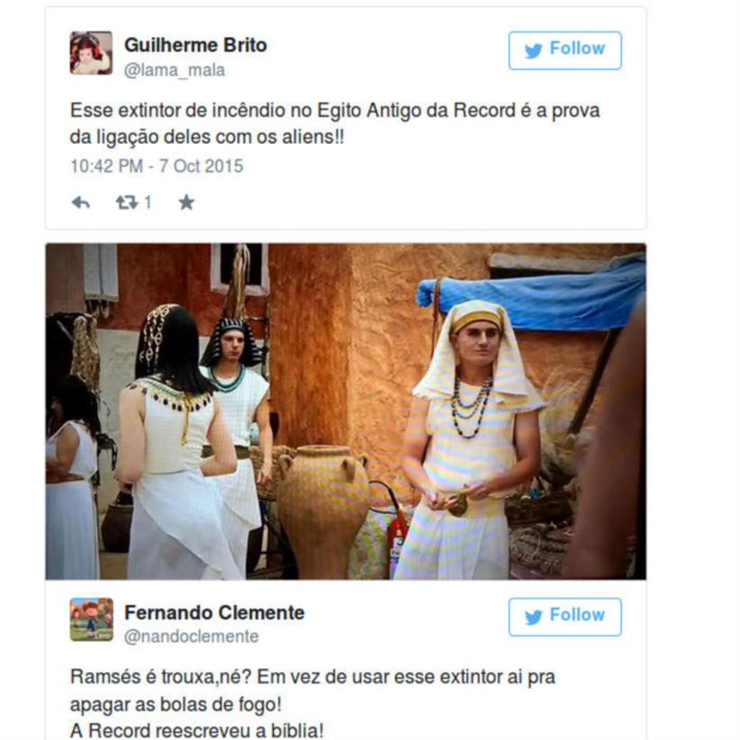 No Twitter, um internauta comentou: "Segundo a Record, um dos #DezMandamentos é:"Segurança acima de tudo". Extintor de incêndio no Egito do Faraó?".