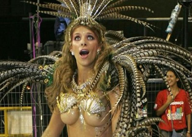 Adriane desfilava como rainha de bateria pela Tijuca, usando uma fantasia nude e prateada e, claro, salto alto. O escorregão foi menos feio que o de Ana, mas levou a apresentadora a se apoiar completamente no chão.