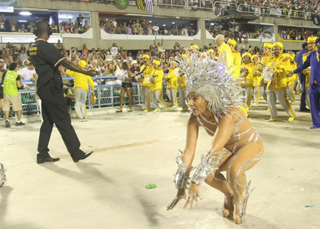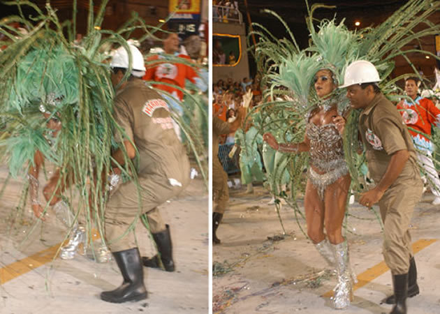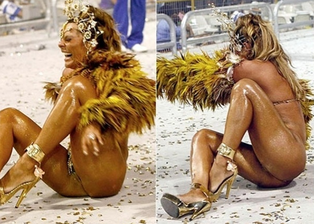 O salto de Rita chegava aos 20 cm, por isso quando a passista deu o azar de escorregar nos papéis picados que estavam na avenida acabou caindo com tudo.