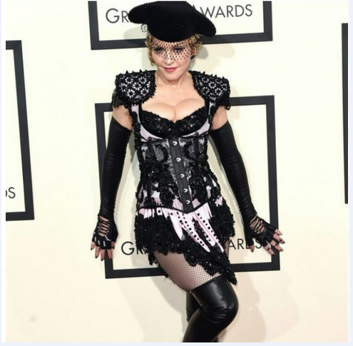Madonna ousou na escolha do look para ir ao Grammy Awards 2015 e apareceu na premiação usando um modelito com decote arrasador e muito brilho.