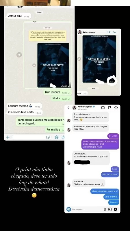 Depois, PA mostrou o print da conversa com Arthur, que ainda o respondeu. "Que loucura... porque é esse mesmo número que está aí. Mas enfim... obrigado".