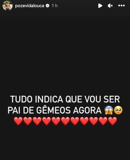 O funkeiro postou nos Stories do Instagram: "Tudo indica que vou ser pai de gêmeos agora", com emojis de muitos corações.