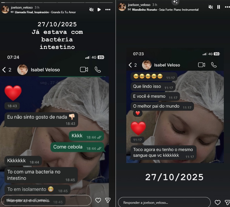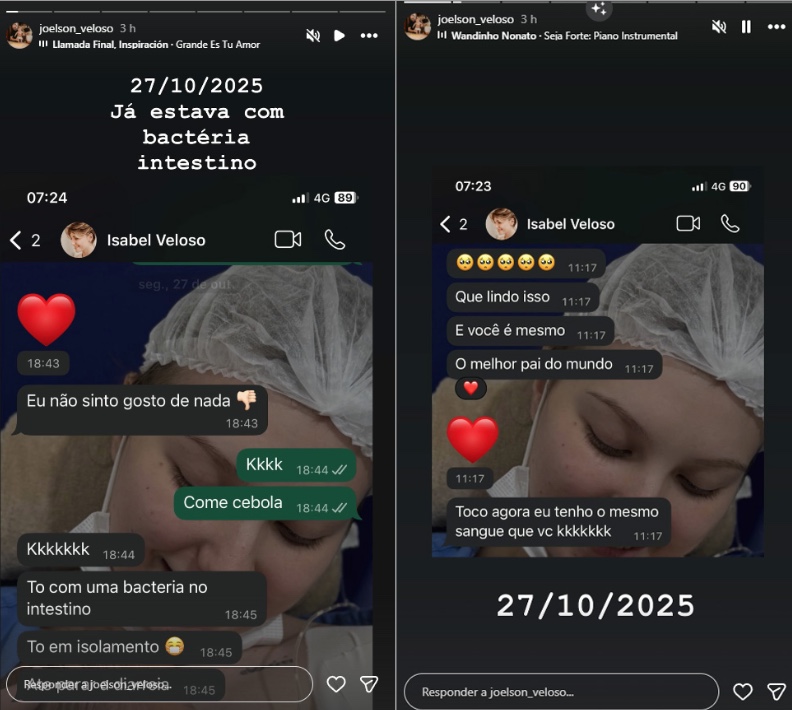 O pai da influenciadora Isabel Veloso, Joelson Veloso, usou as redes sociais nesta terça-feira (20) para divulgar uma troca de mensagens com a filha durante o período em que ela esteve internada, pouco mais de dois meses antes de morrer, no dia 10 de janeiro. As conversas foram publicadas nos Stories do Instagram e mostram momentos de fragilidade vividos por Isabel após um transplante de medula.