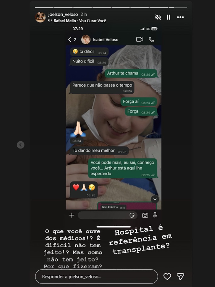 Ao compartilhar as mensagens, Joelson fez um desabafo e questionou a condução do atendimento médico. “Não deram a devida atenção para exames”, escreveu. Em outra publicação, ele afirmou não compreender como um hospital de referência em transplantes teria seguido com o procedimento diante das complicações enfrentadas pela filha.