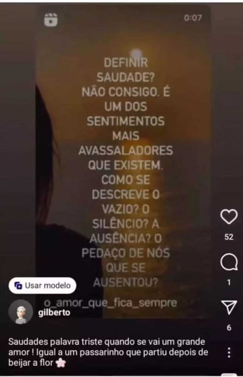 "Definir saudade? Não consigo. É um dos sentimentos mais avassaladores que existem. Como se descreve o vazio? O silêncio? A ausência? O pedaço de nós que se ausentou?", refletiu ele, que ainda escreveu na legenda: "Saudade: palavra triste quando se vai um grande amor. Igual a um passarinho que partiu depois de beijar a flor", escreveu.