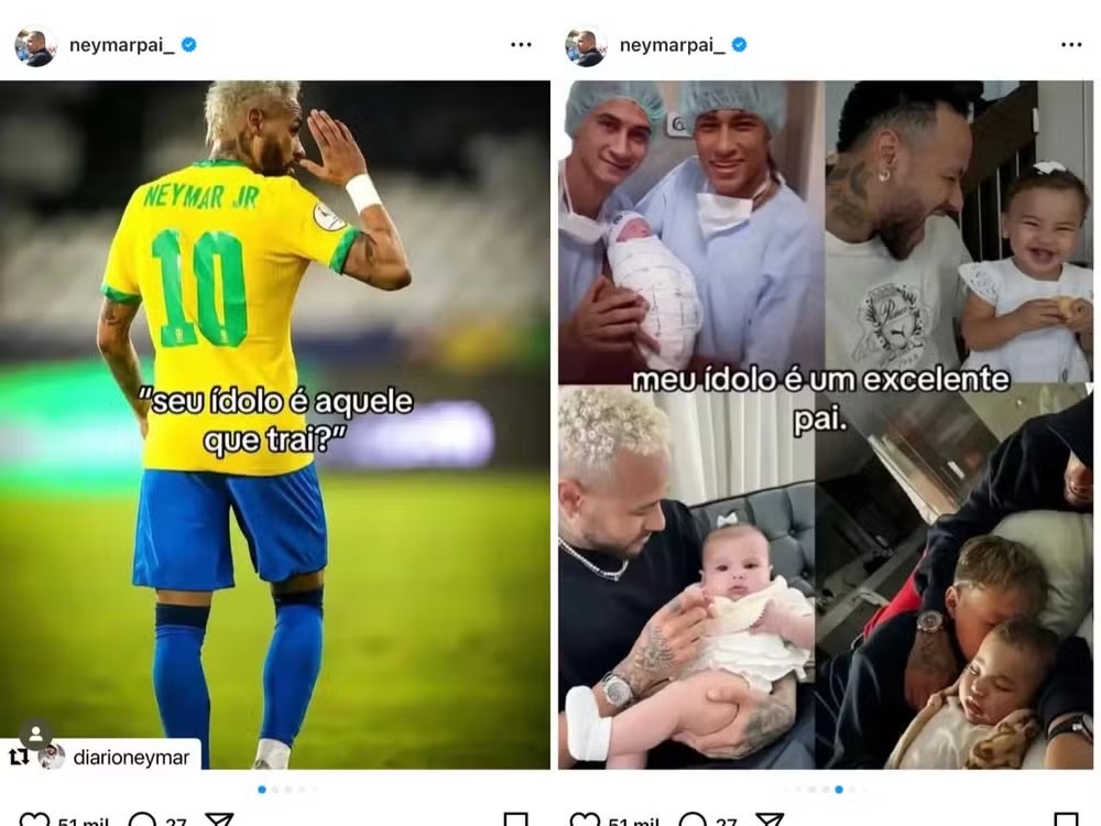Nesta terça-feira (10), momentos antes do aguardado leilão beneficente de Neymar, o pai do jogador, Neymar Pai, utilizou suas redes sociais para repostar uma publicação em defesa do filho. O empresário publicou um carrossel de fotos com mensagens em que minimiza as recentes controvérsias sobre supostas traições e destacando a dedicação a causas sociais e conquistas no futebol.