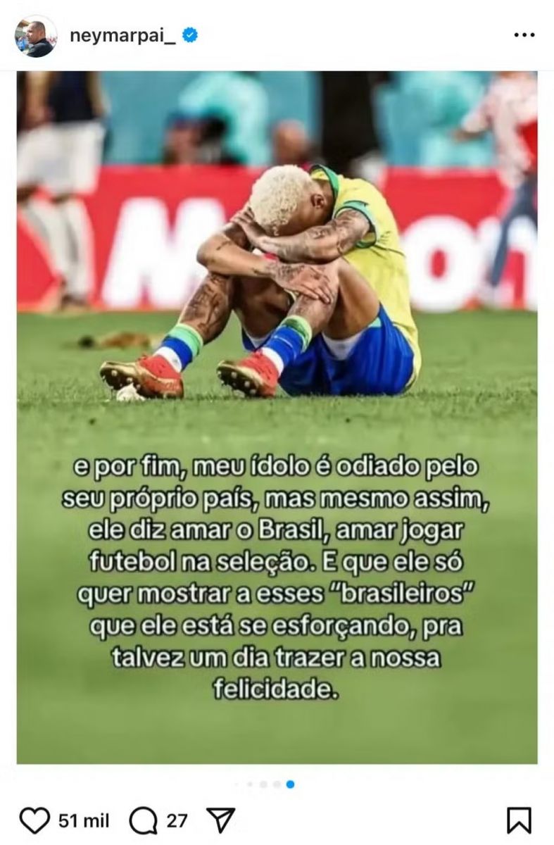 Neymar Pai encerra o post com uma crítica alegando a falta de admiração dos brasileiros, afirmando que, apesar do "ódio" que o jogador enfrenta em seu próprio país, ele persiste em campo para trazer "felicidade" à nação.