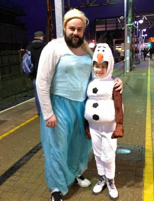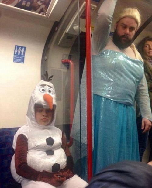 Um tatuador barbudo que pesa 100 kg se fantasiou de Rainha Elsa para cantar com sua filha em uma festa karaokê de Frozen. Rob Chillingworth e a filha Ruby, que se vestiu de Olaf, foram flagrados no metrô de Londres e as fotos dos dois tornaram-se virais nas redes sociais, sendo postadas no Reddit e no Twitter.