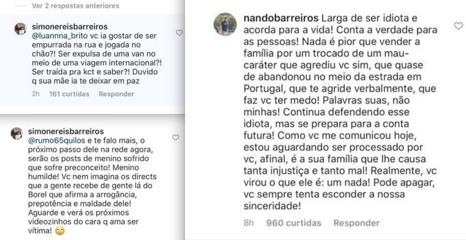 “Você ia gostar de ser empurrada na rua e jogada no chão? Ser expulsa de uma van no meio de uma viagem internacional? Ser traída pra C#%¨& e saber? Duvido que sua mãe ia te deixar em paz”, disse Simone em um comentário no Instagram.