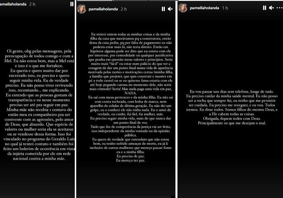 "Eu quero, de verdade, que entendam que eu não estou bem. Eu tenho sofrido ameaças de morte. Eu já li, inclusive, de outras mulheres, que mereço passar fome, eu e minha filha. Eu preciso de paz. Eu mereço ter paz. Vou passar uns dias sem telefone, longe de tudo. Eu preciso cuidar da minha saúde mental. Eu não posso ser a rocha que sempre fui. Eu tenho que me permitir ser cuidada. Preciso me reerguer e eu vou".