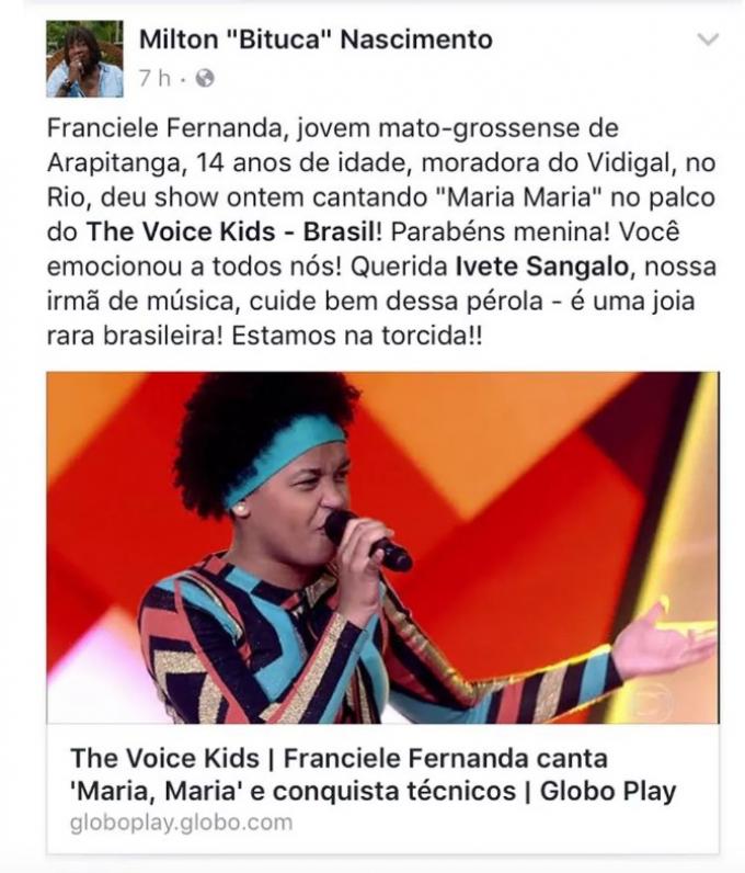 Franciele cantou a música "Maria Maria" e recebeu elogios de Milton Nascimento, que declarou em seu perfil no Facebook sua torcida pela garota na competição. Vários comentários ofensivos foram publicados em resposta ao texto do artista, atacando a menina. Em um deles, um homem identificado como Danilo Ruas se referiu à candidata do reality como "neguinha".