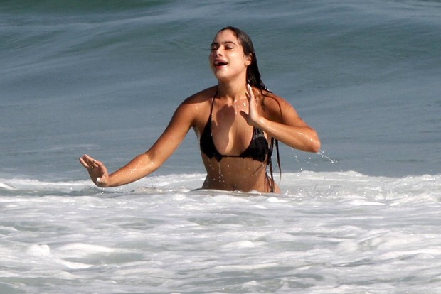 Patrícia Jordane aproveitou o dia ensolarado para se refrescar no mar da Barra da Tijuca, no Rio de Janeiro.